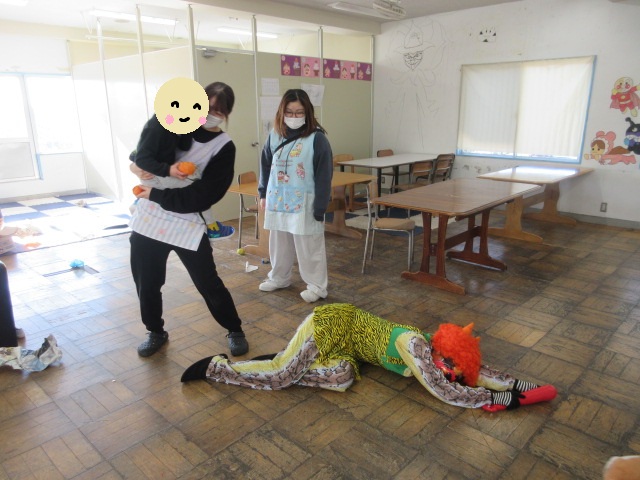 ありのみ学園 今年の鬼を退治しました👹 ありのみ学園 2026年2月9日 2月1日、ちょっと早めに節分の会をしました。 「おにはそとー!ふくはうちー!」 新聞紙で作った豆型ボールを投げて鬼をやっつけました! 鬼「や、やられたー・・・!!」 お昼ご飯は手巻き寿司でした🧑🏻🍳 今年の恵方「南南東」を向いて、いただきまーす✨
